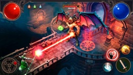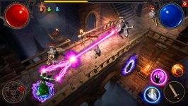Det finns ingen möjlighet till karaktärsval och anpassning här, din väg börjar omedelbart i en av fängelsehålorna. På bara några få steg kommer du att visas hur man bekämpar och dödar onda andar. Vilket är ganska enkelt... i början. Ta med hjälten till skelettet så börjar han automatiskt slå honom med ett svärd. Om du vill slå till med en besvärjelse, tryck på motsvarande knapp längst ner till höger. Joystick-rörelse från nedre vänstra hörnet är en klassiker för mobil rollspelskontroll.